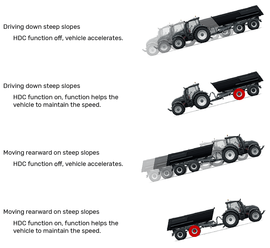When the HDC function is active, the wheel motors resist the wheel movement in the driving direction. You can adjust the HDC power level as you go.
