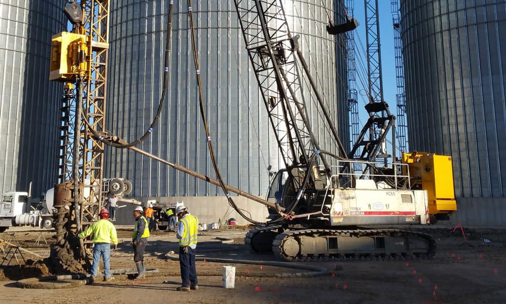Sobald der Bohrer bis zur erforderlichen Tiefe gebohrt hat, kann Beton oder anderes Material durch die hohle Mitte des Bohrers in den Boden des Bohrlochs gepumpt werden, wenn dieser aus dem Loch gezogen wird.