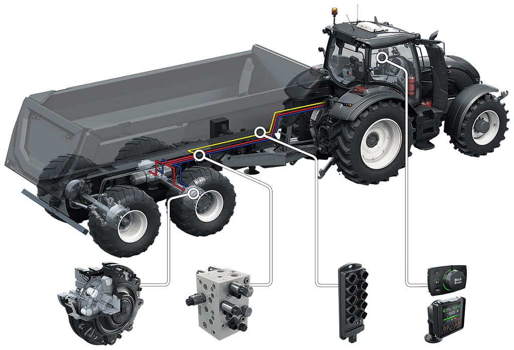 The Black Bruin On-Demand Drive System is a power transmission solution designed specifially for tractor-driven trailers and implements. The core of the system is formed by a hydraulic wheel hub motor, which provides tractive power exactly where it’s needed – right underneath the heavy load. The complete system also includes valves and control electronics and is ideal for use in agricultural, forestry and earth-moving applications. The system has already proven its benefits in multiple applications like slurry tankers, silage wagons, balers, potato harvesters, sprayers and forestry trailers.