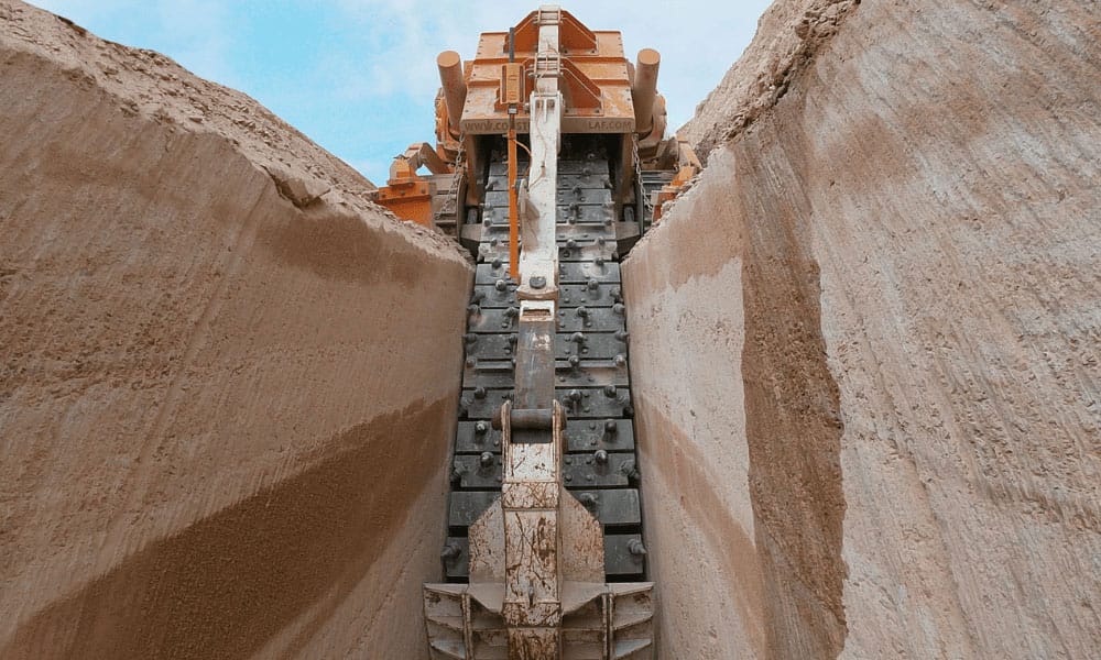Trenching is a very suitable technological solution on long-distance routes and in places of special environmental interest. Calaf trenchers are working throughout Spain and in all kinds of terrain, softer and harder, clay, slate, dolomite, gneiss… The applications include water canals, sewer systems, and solar and wind energy generation parks; wherever you need to sink huge pipelines underground to make the system operational. The trenchers typically do 200-400 metres of trenches per day at 1.5 to 3.5 metres depth and 45-160 centimetres width.